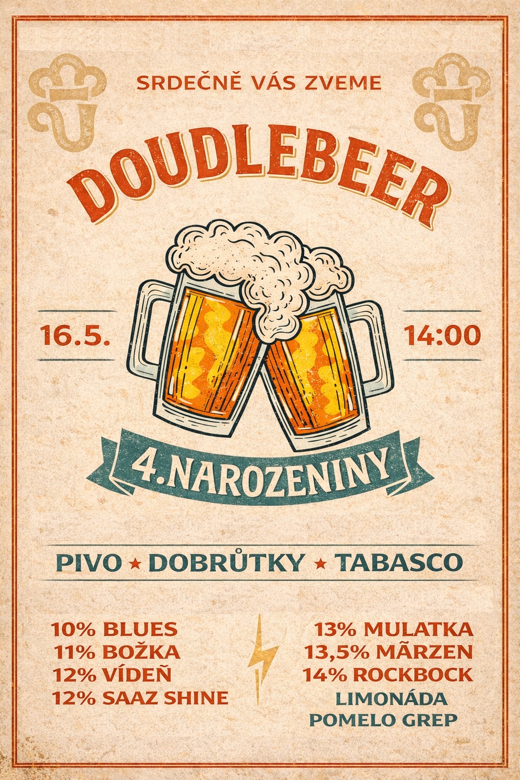 16. května od 14:00 hodin bude naraženo 7 našich druhů piv, nealko pomelo-grep a limonáda pro nejmladší. K zakousnutí budou řízečky, krkovice na chlebu, pikador a další dobrůtky. V podvečer vám bude hrát kapela TABASCO. Všichni jste srdečně zváni.