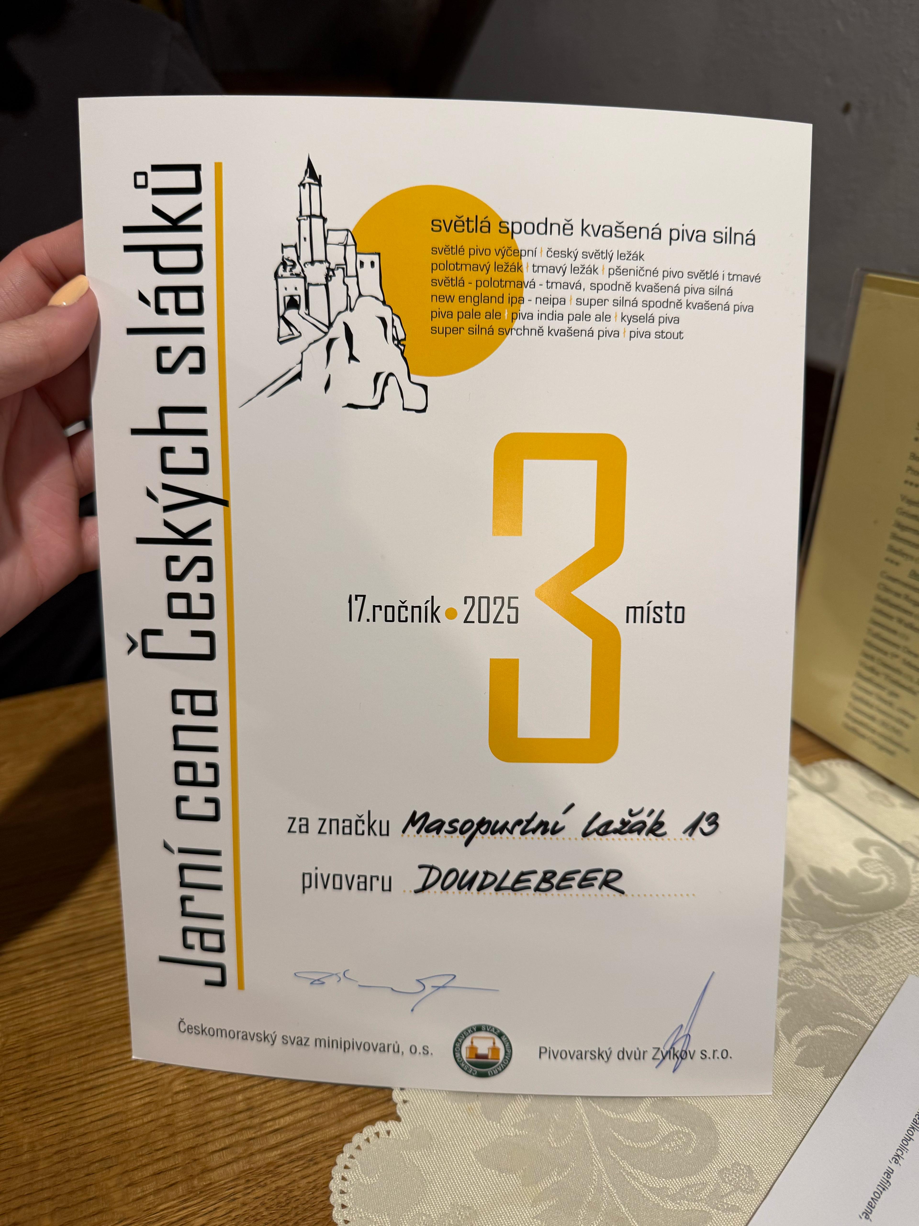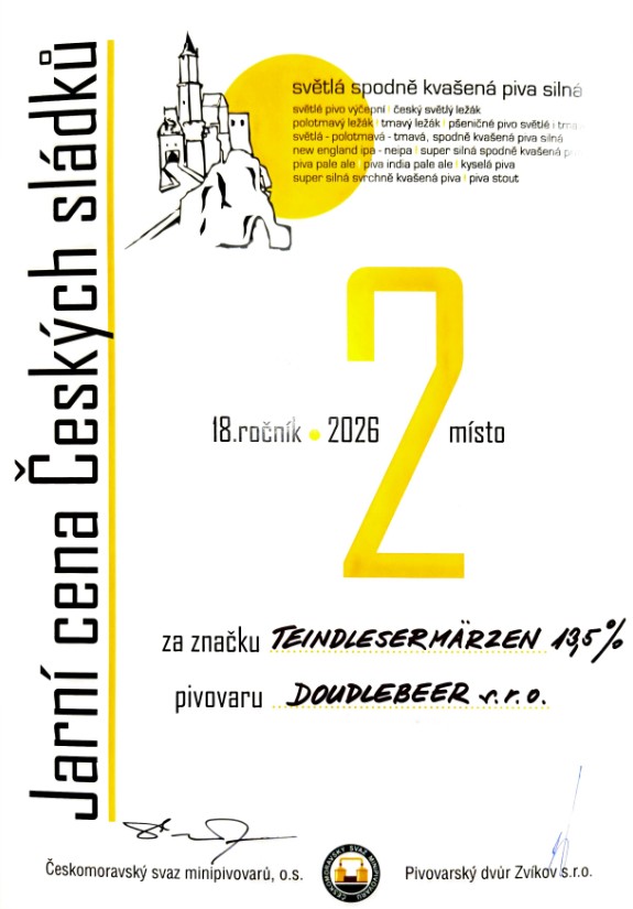 Zvíkov 2026. Druhé místo pro náš Märzen 13,5% v kategorii silné světlé pivo z minipivovaru.